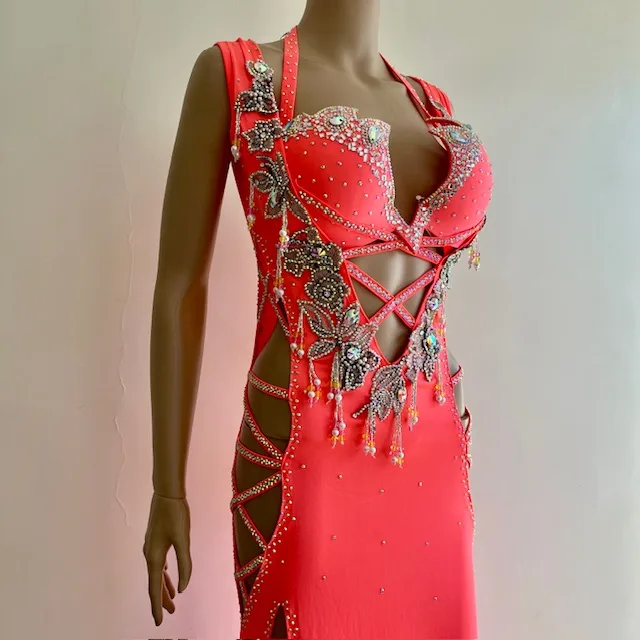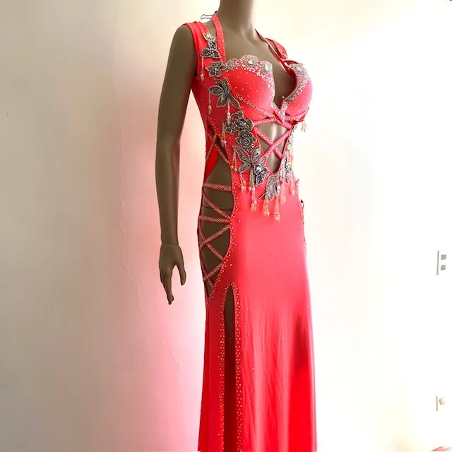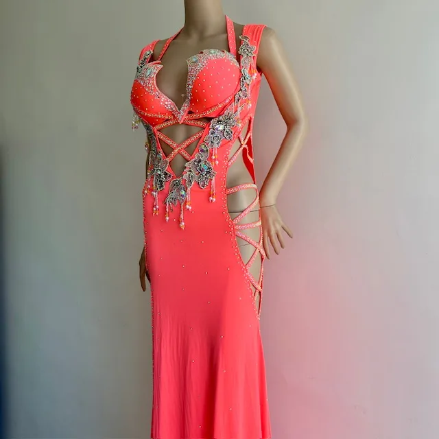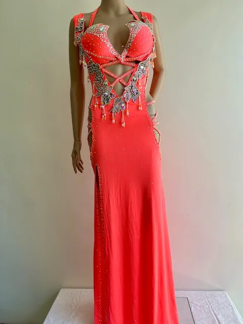 Traje de color brillante, consta de sostén y túnica. Presenta abundantes decoraciones de strass,  y aberturas laterales y en el abdomen.