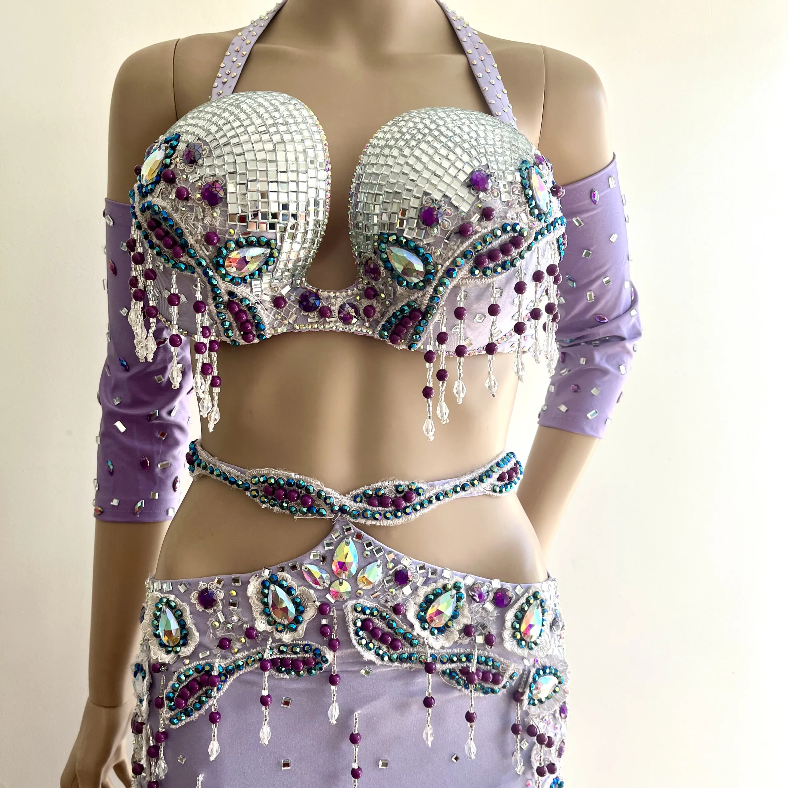Espectacular traje de gala con sostén enteramente cubierto de brillantes, bordados y flecos hechos a mano. El diseño se replica en la falda con cinturoncillo. La falda tiene escotes laterales con tiritas con brillantes, gran caída y amplitud con insertos de gasa fantasía brillante.