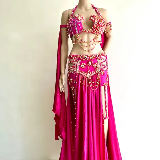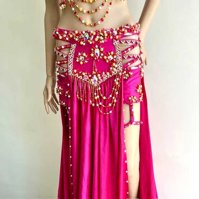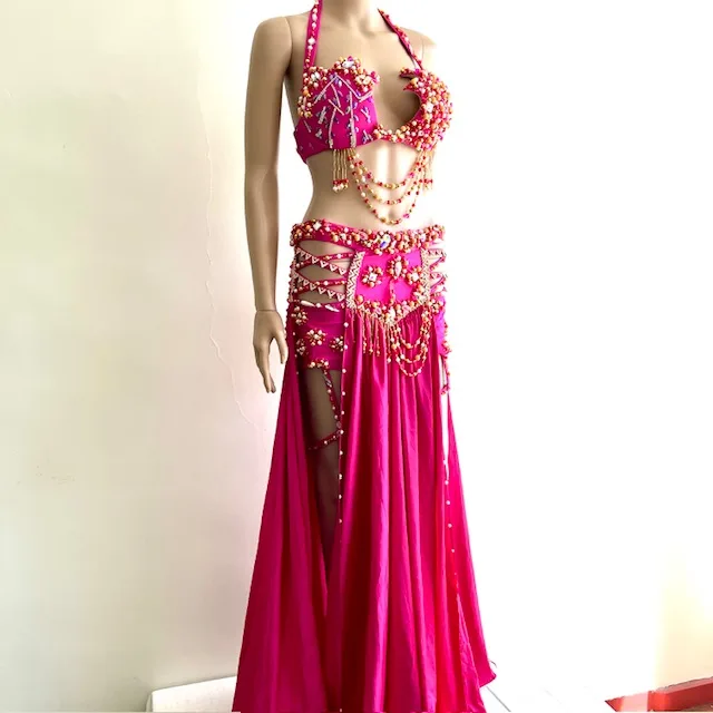 Un traje absolutamente impactante realizado en raso color guinda. La amplia falda tiene aberturas y tajos sobre las piernas, short interior, ligas y ruedo con crinolina. Sostén con terminación en puntas. Sostén y cadera con abundantes bordados en strass, mostacillas, perlitas y flecos. Brazaletes con un gran pétalo.